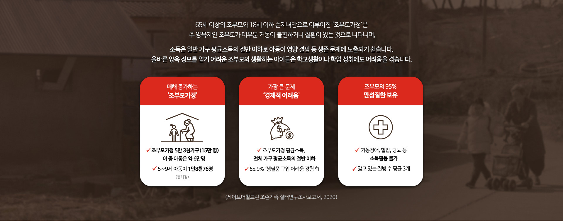 65세 이상의 조부모와 18세 이하 손자녀만으로 이루어진 ‘조부모가정’은 주 양육자인 조부모가 대부분 거동이 불편하거나 질환이 있는 것으로 나타나며, 소득은 일반 가구 평균소득의 절반 이하로 아동이 영양 결핍 등 생존 문제에 노출되기 쉽습니다. 올바른 양육 정보를 얻기 어려운 조부모와 생활하는 아이들은 학교생활이나 학업 성취에도 어려움을 겪습니다.